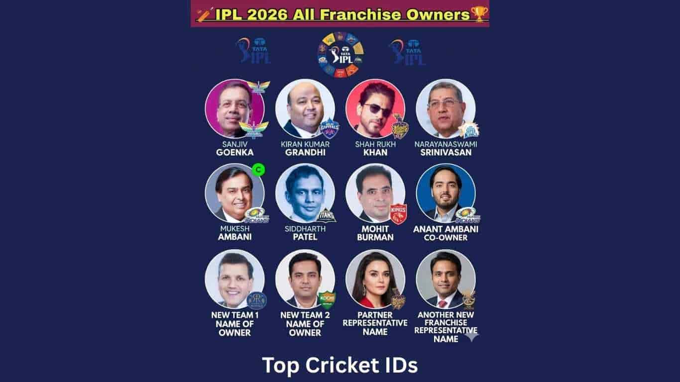 In 2026, the IPL teams are owned by Top businessmen, large companies, and celebrities. For example, Mukesh Ambani and Nita Ambani, Shah Rukh Khan, Juhi Chawla, Jay Mehta, N. Srinivasan, etc.
